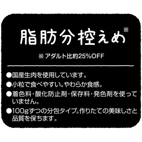 | 特長 | ●素材の旨みが活きた、ソフトタイプの国産プレミアムドッグフードです。 ●国産生肉を100%使用した、小粒で食べやすい、柔らか食感です。 ●保存料、着色料、酸化防止剤、発色剤不使用を使っていません。 ●4つの健康(免疫、皮膚・毛づや、お腹、関節)を維持サポートします。 ●脂肪分控えめです。(アダルト比約25%OFF) ●100gずつの分包タイプで作り立ての美味しさと品質を保ちます。 |
