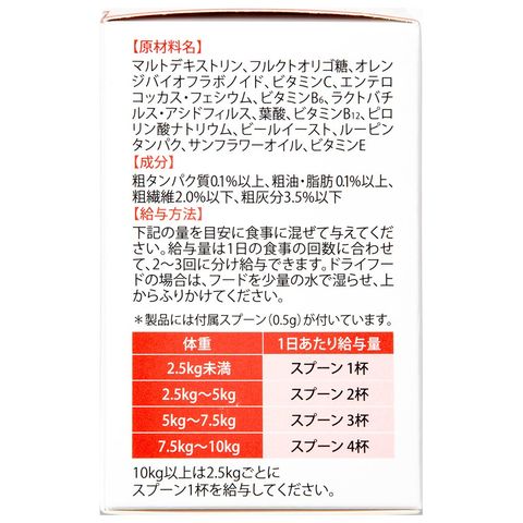 | 与え方 | 1日に下記の量を目安に食事に混ぜて与えてください。給与量は1日の食事の回数に合わせて、2~3回に分け給与できます。ドライフードの場合は、フードを少量の水で湿らせ、上からふりかけてください。 ※この製品には付属スプーン(0.5g)が付いています。 体重2.5kg以下:スプーン1杯 体重2.5kg~5kg:スプーン2杯 体重5kg~7.5kg:スプーン3杯 体重7.5kg~10kg:スプーン4杯 ※10kg以上は2.5kgごとにスプーン1杯を給与してください。 |