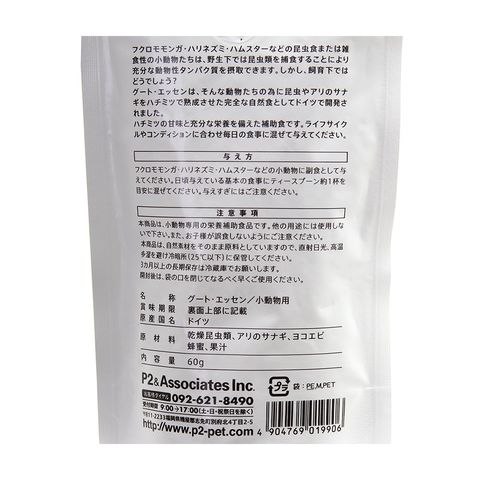 | 与え方 | ●フクロモモンガ・ハリネズミ・ハムスターなどの小動物に副食として与えて下さい。 ●日頃与えている基本の食事にティースプーン約1杯を目安に混ぜて下さい。 ●与えすぎには、ご注意下さい。 |