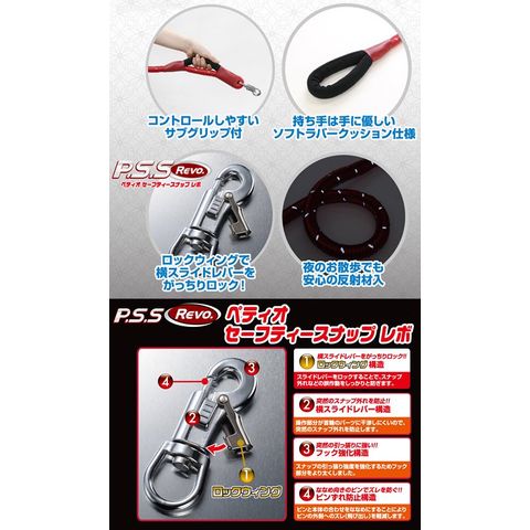 | 特長 | ●スライドレバーをロックすることで、スナップ外れなどの誤動作をしっかりと防ぎます。 ●操作部分が首輪のパーツに干渉しにくいので、突然のスナップ外れを防止します。 ●スナップの引っ張り強度を強化するためフック部分をより太くしました。 |
