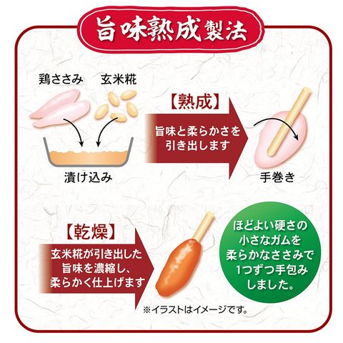 | 特長 | ●旨味熟成製法で仕上げた、極上の美味しさと柔らかさが魅力のおやつです。 ●鶏ささみを玄米糀に漬け込み、じっくり熟成させて旨味を引き出し柔らかく仕上げました。 ●ほどよい硬さの小さなガムを、一手間かけた極上の鶏ささみで1つずつ手包みしました。 |
