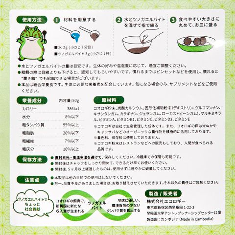 ●魚粉不使用で匂いを軽減し、カエルの健康的な成長をサポートします。