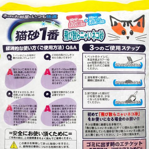 | ご注意 | ※本品は猫砂です。目的以外の用途では使用しないでください。 ※お子様の手の届く所には保管しないでください。 ※無害ですが食べられません。誤って多量に口にしてしまった場合は医師の診察を受けてください。 |