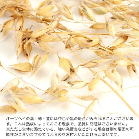 | ご注意 | ※本品は小動物用牧草の穂です。 ※オーツヘイの穂は炭水化物やカロリーが高いので与えすぎに充分ご注意ください。 ※本品は天然素材のため形や色にムラがある場合がございますが、品質には問題がございません。 |