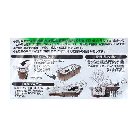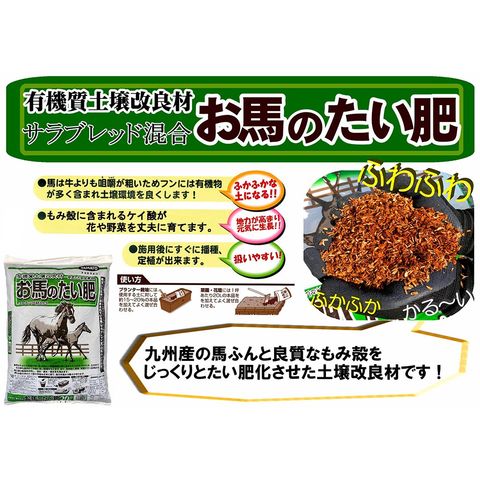 | 特長 | ●九州産の馬ふんと良質のもみ殻をじっくりとたい肥化させた最高品質の完熟たい肥です。 ●限定した飼料で飼育されている馬(サラブレッド混)の馬ふんを使用しました。 ●馬は牛よりも咀嚼が粗いため、糞には有機物質が多く含まれています。そのため土の中での分解も速やかで作物によい環境を提供します。 ●施用後に播種、定植がすぐ行えます。 ●もみ殻の中のケイ素が作物の生長をサポートし、地力を維持します。 |