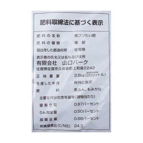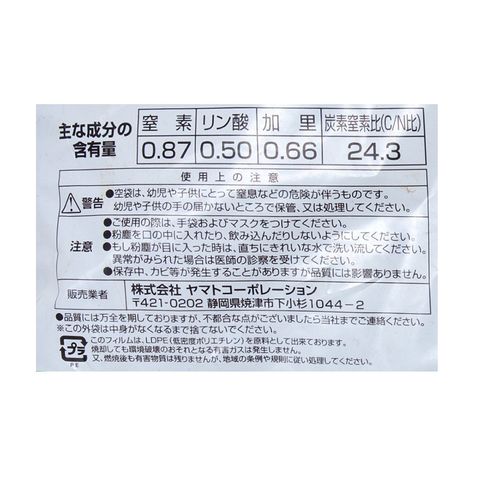| 保証成分量(%) | 窒素全量:0.87 リン酸全量:0.5 加里全量:0.66 炭素窒素比:24.3 |