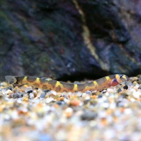 | 種類詳細 | インドネシア原産のローチの仲間です。 黄色と黒の網目模様が美しく、同種でも個体ごとの模様の変異が様々なタイプが見られます。 低層部で物陰に隠れていることが多く、底砂に頭を突っ込んで潜る様子は可愛らしく、まさにドジョウといった感じです。 飼育も容易で餌も何でも良く食べるため、水槽の掃除屋として活躍してくれます。 底砂や流木の下に潜りますが、根張りの良い水草なら抜かれることは少ないです。 時折水面に向かって呼吸をしに行きますが、このときに水面から飛び出しやすいので水槽にはフタがあった方が良いでしょう。 |