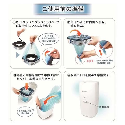 | 使用方法 | ●「パッドロッカー」本体に取付けてご使用ください。 ●フタを開けて使用済みペットシーツを捨てる。 ●たまったら内臓のカッターで袋を切り、端を結んで処分します。 |