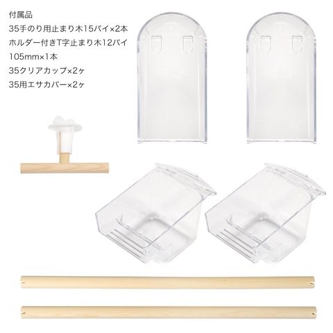 | セット内容 | ●天井アミ×1枚 ●本体横付前アミ×1枚 ●本体横付後アミ×1枚 ●35用底(引き出し付)×1枚 ●35用足付フンキリアミ×1枚 ●35用シャッター×1枚 ●35手のり用止まり木15パイ×2本 ●ホルダー付きT字止まり木12パイ 105mm×1本 ●35クリアカップ×2ヶ ●35用エサカバー×2ヶ |