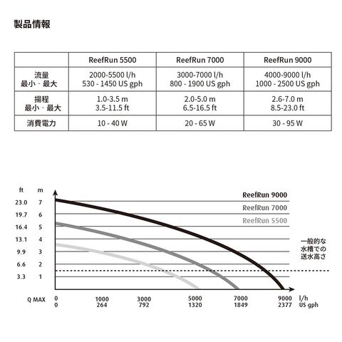 | 仕様 | 流量(最小-最大):3000-7000L/h 最大揚程:5.0m 消費電力:20-65W |