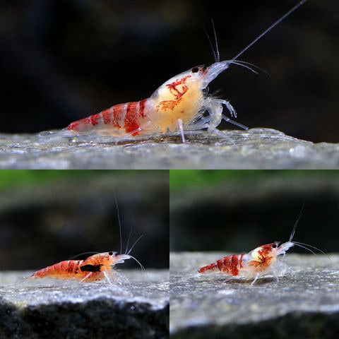 | 種類詳細 | ドイツにて作出された改良品種ですが、どのように作出されたかは不明となっております。 体の上部には、赤いゼブラ模様のような模様が入り、頭部横には乱れた赤い班模様が入り、透明な体からは黄色の発色が見られます。 他の改良品種には見られない特殊な模様の入り方から、独特の清涼感のある美しさを持つエビです。 |