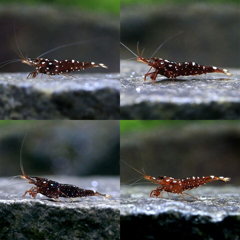 | 種類詳細 | インドネシアのスラウェシ島原産のエビです。ギャラクシーの別名で流通することもある、ランダムに入るスポット模様が特徴的な種です。 体色や模様には個体差が見られ、体色は赤~褐色、体側には白やブルーのスポットがランダムに散りばめられた美しい種です。飼育は他のスラウェシ産のエビに比べ容易で、マタノ湖に生息するといわれていることからpH7の中性付近での飼育が適していると思われます。 物陰を好むことから隠れ家を用意してあげると良いでしょう。 大卵型で水槽内での繁殖も可能で、他のスラウェシ島産のエビの中でもブリードが容易です。 |