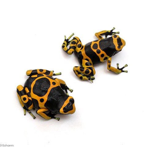 | どんな種類? | ベネズエラを中心に生息するヤドクガエル科(Dendrobatidae)の仲間です。狩りに使用する吹き矢の毒として用いられていたことからヤドクガエルの名前がついています。また、ヤドクガエルの毒は餌として摂取している昆虫から生成されるため、CB個体には毒がないことが知られています。 黒い体に黄色の帯模様が大胆に入る本種は、美しくかつ飼育もしやすいため非常に人気の高い種類です。ヤドクガエルの仲間としては4cm程度とやや大型になりますが、性格は穏やかで、個体間での争いもほとんどありません。基本的に地上棲ですが、ケージ内を立体的に作ると活発に動く様子が見られるでしょう。 |