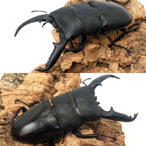 | どんな種類? | フィリピンのパラワン島に生息する世界最大のヒラタクワガタです。 その大きさは100mmを超え、ワイルド個体では体長が111mmのものが知られ、飼育下でも112mmというサイズが作出されています。 長い大アゴは細く、直線的に伸びるのが特徴で、他のヒラタクワガタとも容易に見分けがつきます。 パラワン島の南西部にあるバラバック島に生息するものはより太い体と大アゴを持ち、希少性が高いことからバラバックオオヒラタの名で珍重されています。 大きなサイズだけでなく、ブリードが容易なことや、ケンカが強いことからも人気で、クワガタ相撲などでは必ず上位に君臨する最強のクワガタです。 飼育、ブリードは容易で長寿なことから大変人気の種です。 ヒラタクワガタの仲間はオスの気が荒くメスが殺されてしまうことがあるため、交尾時以外はオスとメスを分けて飼育すると良いでしょう。 冬場の低温には弱いので温度管理が必要です。 |
