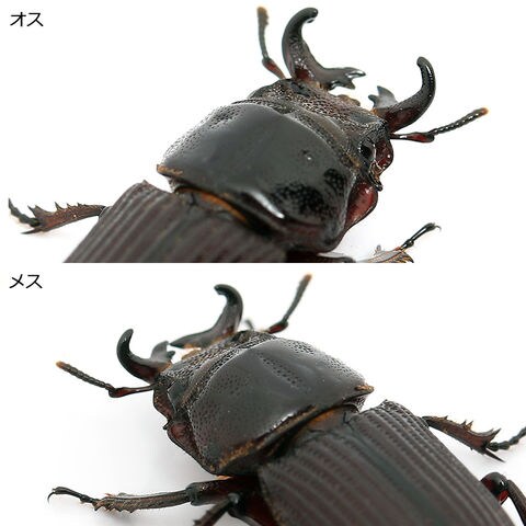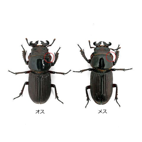 | どんな種類? | 本種は、樹液などを主食とするクワガタ類よりは肉食質の食性の方を好み、樫の木や椎の木の根元から染み出る樹液も吸うことがあるようです。 他のクワガタと異なり、顎は内歯と外歯が左右とも上下に展開し独特なフォルムをしています。オスもメスも顎があり、オスは胸部両側にウチワ状の突起が大きく展開し、メスも同様に胸部両側に突起がありますがそれほど展開せず、見比べないと雌雄の判別は難しいです。 珍物の小型クワガタで、国内では和歌山県以南に棲息しています。 幼虫期間は3~4か月程度でクワガタ用の醗酵マットで飼育し、飼育下では5~6ヵ月程度で羽化します。成虫は腐肉食の食性ではありますが、昆虫ゼリーとミルワームまたはドッグフードなどとを併用して与えます。基本的には南方種ですので、気温が16度を下回らない環境での飼育を心がけてください。 |