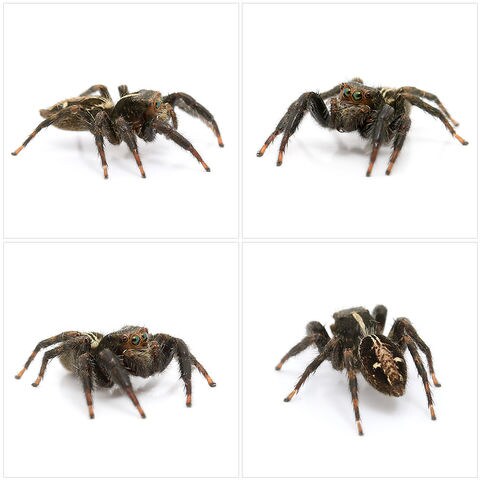 | どんな種類? | 本種は、個体差によってミスジハエトリグモのようなストライプ模様が、オス、メスともに薄っすら現れますが、腹部に少しだけスポット模様があることで、その違いがわかります。 本種も全体的に毛で覆われ、水滴などは弾く構造になっています。 他のハエトリグモと同様に腹部先端にある糸疣(シユウまたはイトイボ)から糸を伸ばし、万が一、落下しても糸を匠に使いこなし、ぶら下がりながらゆっくりと降りてゆくことができます。 歩脚(第一脚)を器用に使いショウジョウバエなどの小型昆虫を捕まえることができます。その姿はまるでカニの様です。 本種は、小型のアリやコバエなどを好んで捕食し、夜間は眉をつくって寝袋を作り、明るい時間は立体駆動しながら狩りをしています。 |