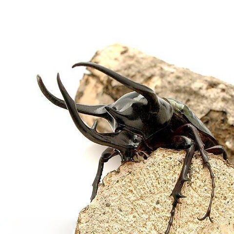 | どんな種類? | 東南アジア最大、最強のカブトムシです。3本の大きな角が特長で、非常に長い前脚と美しい艶を持つ上翅が魅力的な種です。 広い生息域を持ち、地域ごとに形態の差が見られます。以前は和名にもなっていた“コーカサス”(caucasus)の学名は変更され、各地域ごとに亜種として細分化されました。 スマトラ島産亜種は胸角が直線的で、頭角に矢じり状突起が見られず、やや角ばった体型を持ちます。最大サイズの個体は本産地から得られています。 マレー半島産亜種は胸角の湾曲が強く頭角の矢じり状突起が見られません。一般に多く流通するコーカサスは基亜種のジャワ島産のものが多く、頭角の先端に矢じり状の突起を持ち、胸角の湾曲はマレー半島産とスマトラ産の間ほどです。 世界最強のカブトと呼ばれるほど闘争心が強いため、オスとメスは交尾時のみ一緒にして、普段は別のケースで飼育する必要があります。オスの胸部と腹部の隙間は鋭利ではさむ力も強いため、取扱時には注意が必要です。 生息地では標高が1000mを超すところで見られ、あまり高温には強くありません。夏などは室温が暑くなり過ぎないように注意が必要です。 |