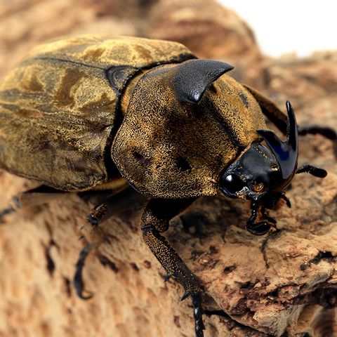 | どんな種類? | 全身に生えた微毛によりサビ色に見える小型のカブトムシです。 日本のカブトムシにも近い種で、胸部に生える角と二又の頭角は日本のカブトムシをそのまま小型にしたようです。 全身に生えた微毛は美しく、小型で可愛らしく魅力的な種で、多頭飼育が可能で鑑賞にも向いています。 ブリードも簡単なことから根強いファンが多く、パプキン同様に女性にも人気のある種です。威嚇時にギィーギィー鳴くのも面白い特徴です。 飼育は非常に容易で、サイズが小さいことから多頭飼育も可能です。羽化までのサイクルも早く、新成虫であれば寿命も短くないので容易にブリードを楽しむことができます。若干低温には弱いところがあるので、冬には加温が必要です。 |