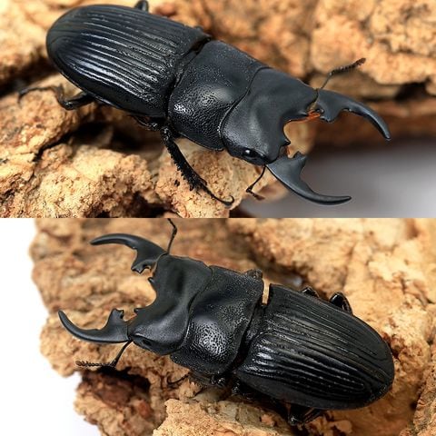 | どんな種類? | ネブトクワガタの中でも大アゴのかっこよさから最も人気の種です。小型種が多いネブトクワガタの中でも50mmを越える大型種で、オスは斧のような内歯が非常に迫力があります。横幅のある体型と、独特の形状をした大アゴから、ネブトクワガタとは思えぬほどの重厚感をもちます。6亜種が知られ、イリアンジャヤ産(ssp.leopoldi)のものが多く流通しています。飼育、繁殖は容易で、ネブトクワガタの入門種といえるでしょう。 ネブトクワガタの仲間はクワガタの中でも独特の生態をもちます。倒木がシロアリなどの活動で分解された泥状のフレーク質に産卵し、幼虫はそのフレーク質をエサとしています。そのため飼育下では産卵木は不要で、微粒子の発酵の進んだマットを使用する必要があります。幼虫はツヤクワガタのようにマット内で繭を形成し、繭の中で蛹化、羽化します。成虫は小型の種が多く、あまり注目されることはありませんが、扁平したオオクワガタのような体型と、小型種でもよく発達する大アゴから愛好家も少なくありません。成虫はウロや樹洞等の隠れられる環境を好みます。 飼育は容易で繁殖も容易です。気が荒いのでオスとメスは分けたほうが良いでしょう。 |