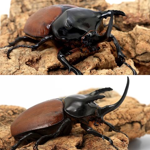 | どんな種類? | ゴホンヅノカブトの近縁種で、オスには頭部に1本、胸部にノコギリ状の角が2本、合計3本の角があります。 体色は頭部、前胸が黒色、上翅は暗橙色~小豆色を呈します。 危険を感じるとと上翅と腹部をこすり合わせてキューキューという音を発します。 飼育や繁殖などの生態についてはまだ分かっていない事が多い種類です。 |