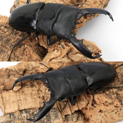 | どんな種類? | フィリピンのミンダナオ島に生息するオオヒラタの仲間です。パラワンに似た細く長い大アゴをもっています。 現地では果実などを食べる害虫として嫌われているようですが、貴重なタンパク源として幼虫や蛹は食用にもされているようです。 パラワンよりは大きくならないものの、細く長い大アゴ、太い体などオオヒラタとしての魅力は強く、また飼育ブリードが容易なことから、外国産ヒラタの中でもオススメの種類です。 ヒラタクワガタの仲間はオスの気が荒くメスが殺されてしまうことがあるため、交尾時以外はオスとメスを分けて飼育すると良いでしょう。冬場の低温には弱いので温度管理が必要です。 |