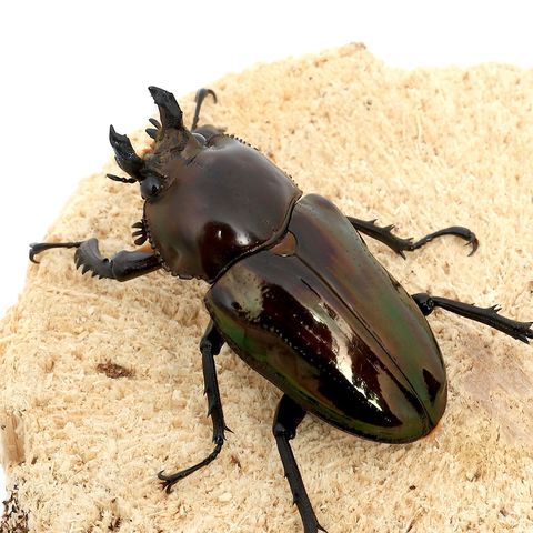| どんな種類? | 世界で最も美しい色彩を持つクワガタです。 パプアキンイロクワガタと近い種で、小さな頭部、上方へ湾曲する大アゴ、独特の体型を持ちます。 メスは上翅に刻点を持ち、タマムシのようなニジイロに輝く体色は緑系、赤系、ブラックなどのバリエーションが見られます。 美しい体色を持ち、寿命が長く、飼育・ブリードが容易で初心者から楽しめることで人気の種です。 幼虫、成虫ともに強健な種です。産卵数が多く羽化不全が少ない点から非常にブリードが容易で、 流通している個体もブリード個体が多いです。本種は生物の持ち出しを禁止しているオーストラリア原産のため、 今後ワイルド個体が流通することは望めないでしょう。 オスのアゴの力が弱いので、同じケースでの多頭飼育が可能です。30℃を超えるような高温を避ければ温度、環境に適応する能力も高いです。 |
