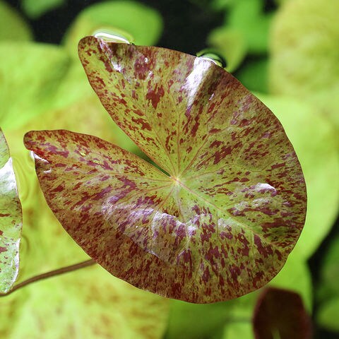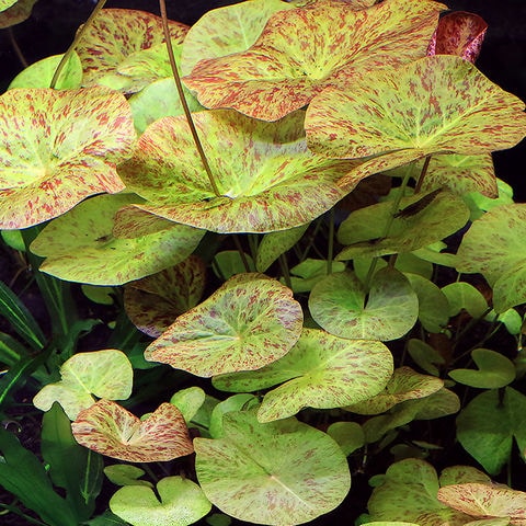 育成難易度 → ★★★☆☆ 2011年にパンタナルレッドスポットヌパールの名称で入荷したニムファの1種です。 葉は光量により黄色~橙色に変化し、赤いスポット状の斑点が散りばめられたような色彩をしています。 浮葉は比較的出しにくい種類で、小型水槽でも比較的扱いやすいサイズです。 育成は高光量、CO2添加を行った環境が望ましく、光量が低い環境ですと葉がライトグリーンかつ小型に収まります。 育成環境が良いと葉の直径が10cm程度まで生長する為、光量や肥料のバランスによりサイズを調整した方が良いです。 夜咲きのため夜間に花を咲かせますが、同様の名称で花の形状が異なる複数種が流通している可能性があります。 本種は白色の花を咲かせるタイプです。 |