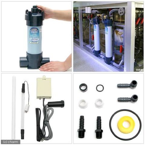 | セット内容 | ●本体 ●クォーツスリーブ ●UV球(殺菌灯電球) ●電子安定器(セット) ●ヘッドキャップ ●セーフティキャップ ●ラバーガスケット(クォーツスリーブ用Oリング付) ●ソケット(4ピン) ●ソケットカバー ●本体Oリング ●プロテクションスリーブ ●オーバーフローパイプ ●クリアビューポート ●リアビューポートOリング ●エルボホースアダプター ●ホースアダプター ●テフロンテープ |