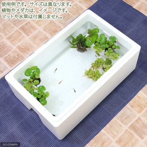 日当たりのよい場所でメダカ育成! 蛍光灯やろ過フィルターは不要。保温性に富んだ発泡スチロールを使用した手軽に水辺の雰囲気を楽しめるメダカ育成セットです。カルキ抜きや水質調整剤で飼育水を作り、水温を合わせてメダカを投入するだけ! メダカは丈夫で水質の悪化や低温にも耐えうる強靭さを持っています。浮き草は、観賞だけでなく、葉の裏や根の周囲がメダカのよい隠れ場所になります。また、浮き草の根にメダカは卵を産みつけますので、複数飼育すれば繁殖も楽しめます。