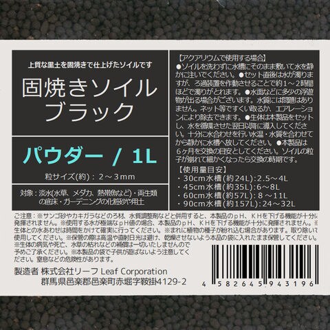 固焼きソイル ブラック パウダー 1L 4582645943196 メダカ 熱帯魚 エビ シュリンプ アクアリウム用品 アクア用品 底床 ソイル 土 黒 こげ茶 吸着系 微栄養系 水草 pH ペーハー KH 酸性 弱酸性 軟水 有機酸 コケ 抑制 肥料 育成 養分 栄養素 栄養 ミネラル ブラック 黒土 天然 ビバリウム テラリウム 両生類 蛙 カエル サラマンダー 20250507 y25m05 kszk pus2507leaf01