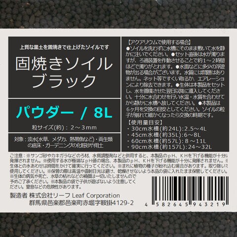 固焼きソイル ブラック パウダー 8L 4582645943219 メダカ 熱帯魚 エビ シュリンプ アクアリウム用品 アクア用品 底床 ソイル 土 黒 こげ茶 吸着系 微栄養系 水草 pH ペーハー KH 酸性 弱酸性 軟水 有機酸 コケ 抑制 肥料 育成 養分 栄養素 栄養 ミネラル ブラック 黒土 天然 ビバリウム テラリウム 両生類 蛙 カエル サラマンダー 20250507 y25m05 kszk hwlist hw1fnslist pus2507leaf01