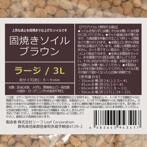 固焼きソイル ブラウン ラージ 3L 4582645943417 メダカ アクアリウム用品 アクア用品 底床 ソイル 茶色 ブラウン 吸着系 弱アルカリ性 有機酸 コケ 抑制 肥料 育成 養分 栄養素 栄養 ミネラル 天然 赤土 ガーデニング用品 園芸用品 用土 多肉植物 ビバリウム テラリウム 両生類 蛙 カエル サラマンダー 20250507 y25m05 kszk hwlist hw1fnslist pus2506leaf05 pus2507leaf01