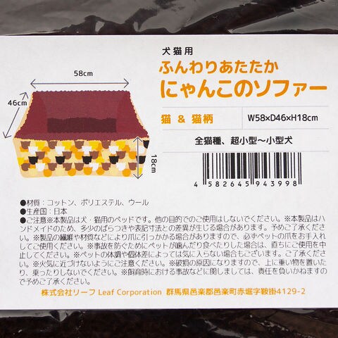 | 特長 | ●にゃんこ柄のかわいいペット用ソファーベッドです。 ●ふわふわのボア生地でぬくぬくあったか。 ●保温性が高く、体を包み込むような温かさが得られます。 |