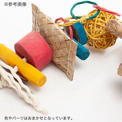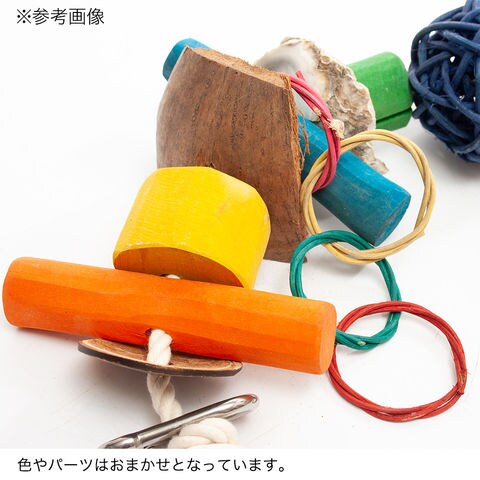 | 特長 | ●カラフルなボールやブロックを繋げた大型インコ用のおもちゃです。 ●つっついたり、かじったりすることが大好きな子に適しています。 ●ロープで様々な素材を繋いでいるので、長時間飽きることなく遊べます。 ●鳥さんが口に入れても安全な着色をしています。 ●遊ぶことでストレス発散にもつながります。 ●ステンレス製の取り付け金具を採用しているので、錆びてしまう心配がありません。 ●色やパーツはおまかせとなっています。 |