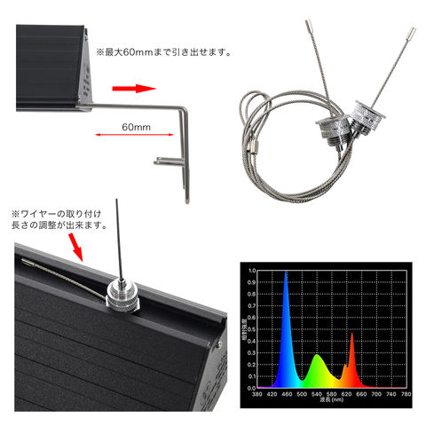 | 仕様 | 電源:入力AC-100V 50/60Hz 消費電力:29.4W チップ個数:色強化20個×3枚 合計60個 色温度(参考値):19500K相当 ※色温度は白色LEDを計測する指標のため、本商品の値は同一の方法で測定した値を記した参考値となっております。人の実際に感じる色味とは異なることを予めご了承下さい。 平均演色性(参考値):Ra74 全光束:3450lm(1150lm×3モジュール) 照度(LED直下36cm):8418Lux Par光合成有効放射μmol/m2s(LED下36cm):148μmol 照射角度:120° 本体表面最高温度:約50℃ 素子カバーのアクリル板厚:1.6mm 耐熱温度(アクリル板):80℃まで 板の透明度:93% |