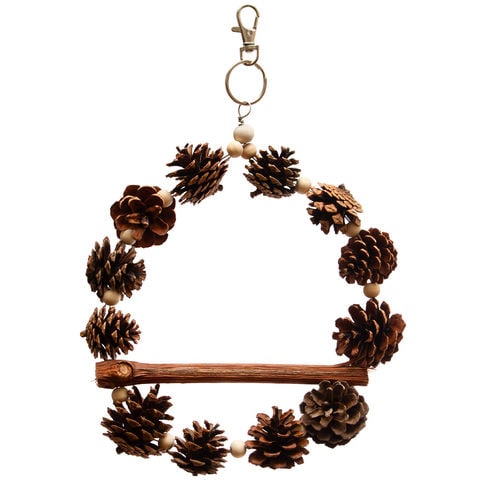 | 特長 | ●松ぼっくりをたくさん使用したリース型のブランコです。 ●止まり木はぶどうの木を使用しているので、樹皮をペリペリ剥いて遊ぶことができます。 ●松ぼっくりをかじって遊ぶこともできます。 |