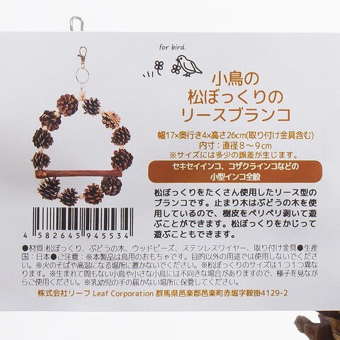 小鳥の松ぼっくりのリースブランコ 小型インコ 中型インコ ハンドメイド おもちゃ 天然素材 4582645945534 リーフコーポレーション リーフコーポ リーフ LEAF Corp necoyama工房 鳥 おもちゃ 玩具 バードトイ 国産 セキセイインコ コザクラインコ マメルリハ ハンドメイド 鳥 天然素材 小型インコ 天然木 松ぼっくり ぶどうの木 ウッドビーズ 木の実 hwlist 20250610 y25m06 kszk hwhmlist leafpinecone