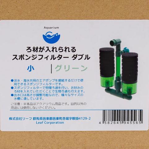 ろ材が入れられるスポンジフィルター ダブル 小 グリーン 4582645945565 アクアリウム用品 アクア用品 フィルター ろ過 流動式フィルター スポンジフィルター 淡水 海水 熱帯魚 生物ろ過 小型水槽 サブフィルター 補助 金魚 メダカ エビ シュリンプ 20250610 y25m06 kszk hw1fnslist leafgrfilter leafspongefilter seitaieventaz202506