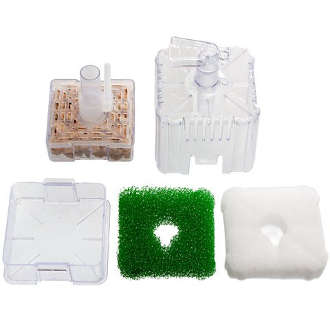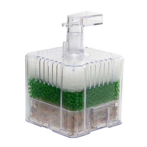 | 特長 | ●シンプルな形状の投げ込み式フィルターです。 ●エアチューブ取り付け位置が上部にあるため、角にピッタリ設置することができます。 ●3種類のろ材で物理ろ過と生物ろ過を行い、クリアな水を維持します。 ●出水口は高さが調整可能で、水位の低い水槽にも適しています。 |
