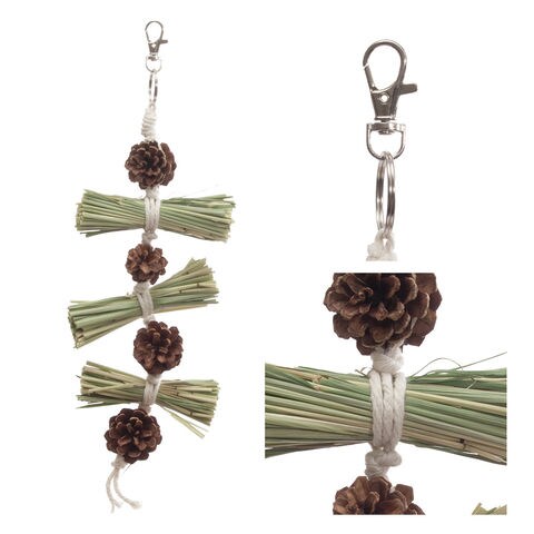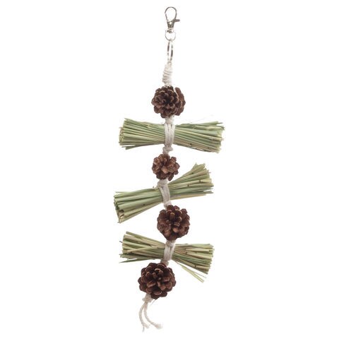 | 特長 | ●自社農場で無農薬栽培し、自家乾燥させたオーツヘイ(えん麦)を使用した小鳥用のおもちゃです。 ●天然素材の松ぼっくりも使用しているので、つっついたりして遊ぶことができます。 ●チモシーは引っ張り出したりかじったりして遊ぶことができます。 ●天然素材をそのまま使用しているので、安心安全です。 |