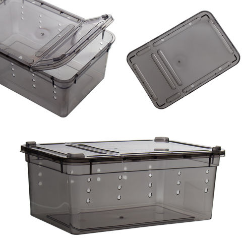 | 特長 | ●アイデア次第で様々に使用できる多用途ケースです。 ●小型爬虫類、小型小動物、小型昆虫の飼育に最適です。 ●大小のフタが開閉するため、蓋を取り外すことなくメンテナンスやエサやりをすることができます。 ●スタッキング構造になっており、本品を上下に複数積み重ねることも可能です。 ●ケース側面に通気穴を確保しています。 |
