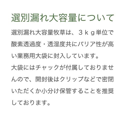 | 選別漏れ大容量チモシーについて | 選別漏れ大容量は3kg単位で酸素透過度・透湿度共にバリア性が高い業務用大袋に封入しています。大袋にはチャックが付属しておりませんので、開封後はクリップなどで密閉いただくか小分け保管することを推奨しております。 |