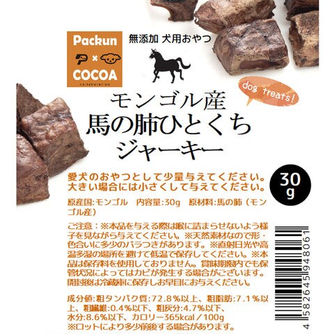 Packn×COCOA モンゴル産 馬の肺ひとくちジャーキー 30g 無添加 無着色 犬 おやつ ドッグフード 関東当日便