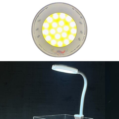| 特長 | ●水槽に引っ掛けて使用するLEDライトです。 ●小型ながらしっかりと明るいので、小型水槽をしっかりと明るく照らすことができます。 ●フレキシブルアームになっているので、光の当たる角度を自由に調整できます。 ●1つの基盤に複数のLEDチップが付いているので、均一でムラの無い光になっています。 ●コードにスイッチが付いています。 |