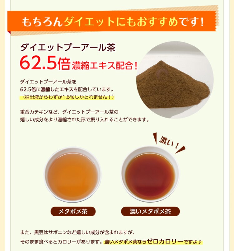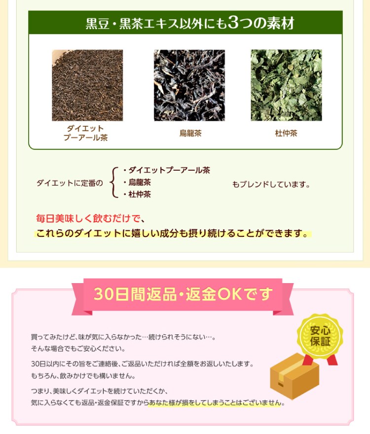 | 原材料(原産国) | 黒豆[大豆](アメリカ・国産)、プーアール茶エキス(国産)、プーアール茶・ウーロン茶・杜仲茶(中国) ■アレルギー物質/大豆 |