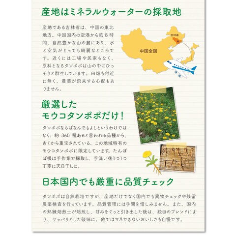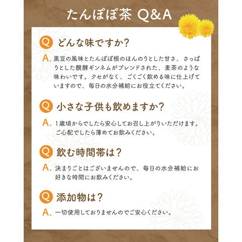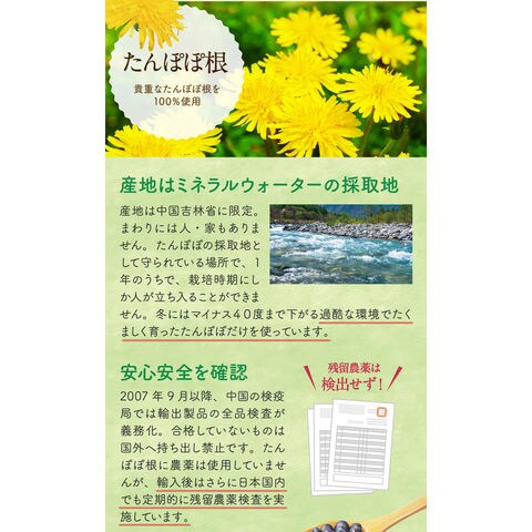 | 原材料 | たんぽぽ根(中国)、醗酵ギンネム(国産)、黒豆(国産) ■アレルギー物質/大豆 |