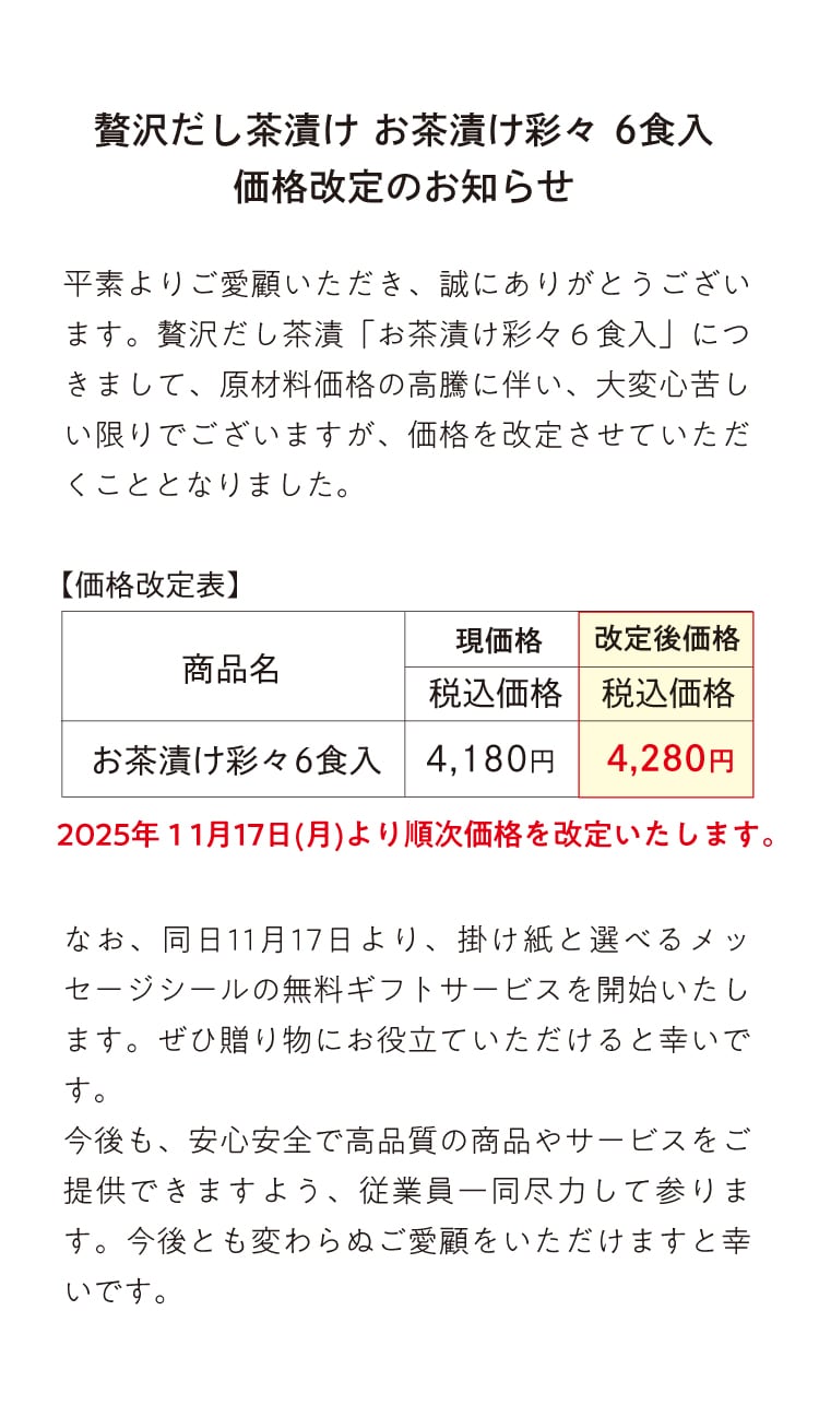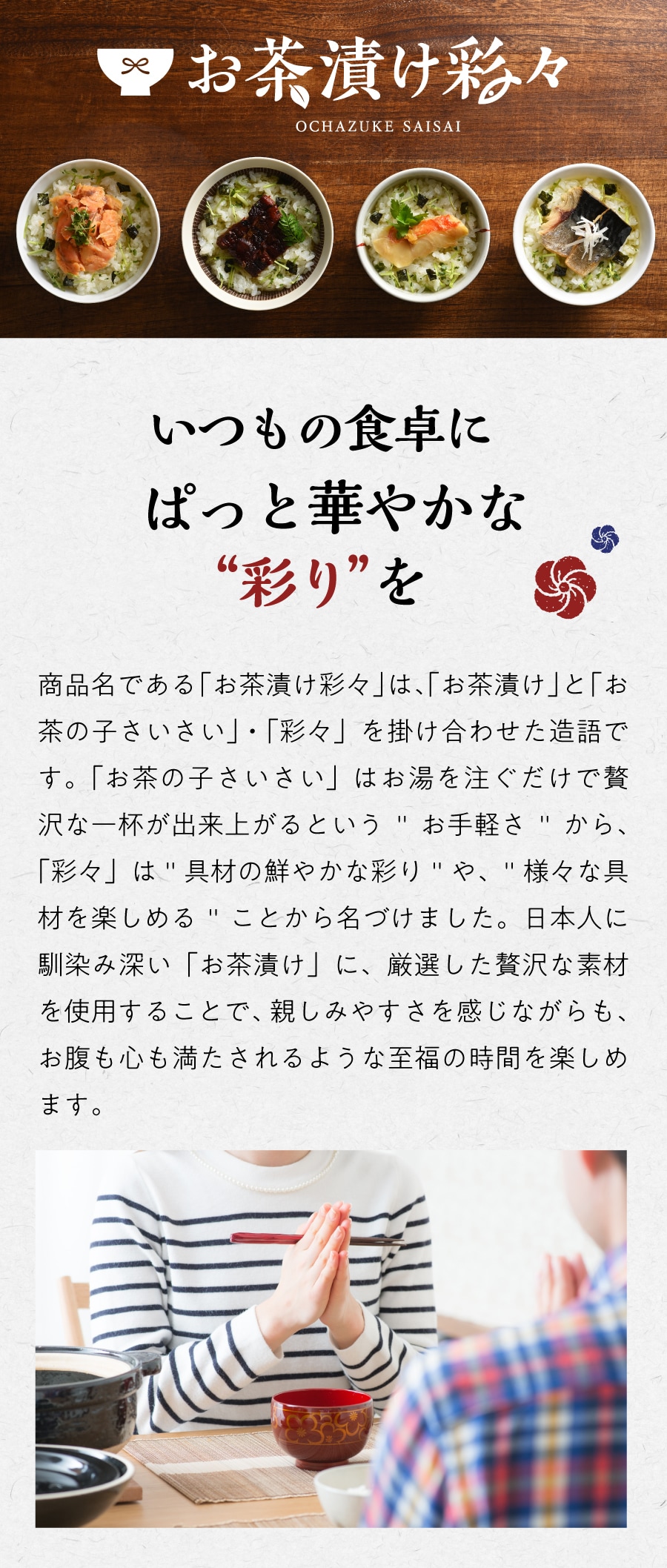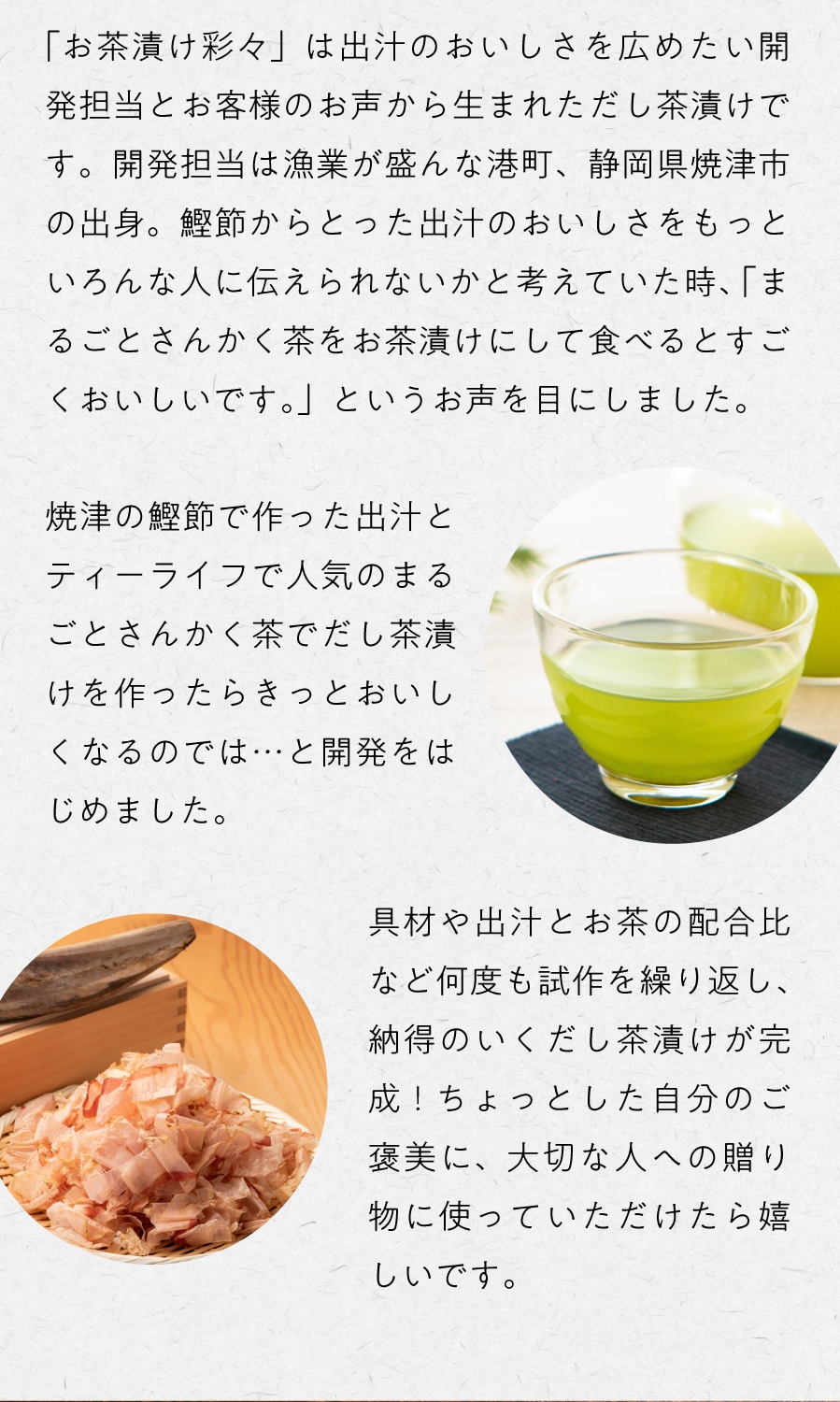 ▽検索キーワード お茶漬け彩々 贅沢 厳選 国産素材 お茶漬け ゆず金目鯛 鰻山椒 金華鯖 銀鮭 鯛 タイ 鰻 うなぎ 鯖 サバ 鮭 サケ 保存料不使用 化学調味料不使用 静岡 お茶屋 焼津市 老舗 鰹節屋 出汁 鰹節 焼きあご煮干し さば節 昆布 緑茶ブレンド 緑茶 深蒸し茶 石臼挽き抹茶 煎り米 冷やし茶漬け 冬 お歳暮 お年賀 人気 手軽 専用 ギフトボックス 熨斗 食事 食品 高級食品 グルメ お取り寄せ 送料無料 ティーライフ ▽用途例 ギフト プチギフト プレゼント 贈り物 贈答品 まだ間に合う 御挨拶 ご挨拶 ごあいさつ 心ばかり 進物 寸志 ありがとう おめでとう 手土産 お土産 お返し お礼 御礼 お祝い 御祝 内祝い 結婚式 結婚内祝い 結婚祝い 引き菓子 引き出物 引出物 出産 出産内祝い 出産祝い 引越しご挨拶 新築内祝い 新築祝い 新生活 入学祝い 卒業祝い 就職祝い 快気祝い 快気内祝い 全快祝い 退院祝い 七五三内祝い 初節句内祝い お宮参り 志 御供 御見舞 御見舞御礼 御仏前 香典返し 成人式 七五三 引っ越し 引越し お年賀 御年賀 御年始 お正月 御正月 新年 新年会 暑中見舞い 暑中御見舞 初盆 お盆 お中元 御中元 寒中見舞い 寒中御見舞い お歳暮 御歳暮 忘年会 春ギフト 夏ギフト 秋ギフト 冬ギフト 誕生日 誕生日プレゼント 誕プレ バースデー バレンタイン ホワイトデー ゴールデンウィーク 七夕 ハロウィン クリスマス クリスマスプレゼント 父の日 母の日 父 母 お父さん お母さん 敬老の日 祖父 祖母 おじいちゃん おばあちゃん 還暦 還暦祝い 華甲 古希 喜寿 傘寿 米寿 卒寿 白寿 茶寿 男性 旦那 夫 彼氏 男友達 男友だち 伯父 叔父 女性 嫁 妻 彼女 女友達 女友だち 伯母 叔母 兄弟 姉妹 家族 親戚 夫婦 金婚式 銀婚式 お餞別 帰省 帰省土産 PTA 先生 小学校 中学校 高校 大学 社会人 先輩 後輩 上司 上長 来客 送迎 職場 取引先 成約記念 契約記念 新歓 歓迎会 定年退職 退職 転職 転勤 異動 謝罪 二次会 イベント ノベルティ ビンゴ 景品 記念品 フォーマル 迷ったらコレ |