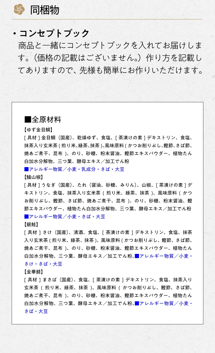●ゆず金目鯛: [具材]金目鯛(国産)、乾燥ゆず、食塩 [茶漬けの素]デキストリン、食塩、抹茶入り玄米茶(煎り米、緑茶、抹茶)、風味原料(かつお削りぶし、鰹節、さば節、焼あご煮干、昆布)、のり、砂糖、粉末醤油、鰹節エキスパウダー、植物たん白加水分解物、三つ葉、酵母エキス/加工でん粉 ●鰻山椒: [具材]うなぎ(国産)、たれ(醤油、砂糖、みりん)、山椒 [茶漬けの素]デキストリン、食塩、抹茶入り玄米茶(煎り米、緑茶、抹茶)、風味原料(かつお削りぶし、鰹節、さば節、焼あご煮干、昆布)、のり、砂糖、粉末醤油、鰹節エキスパウダー、植物たん白加水分解物、三つ葉、酵母エキス/加工でん粉 ●金華鯖: [具材]まさば(国産)、食塩 [茶漬けの素]デキストリン、食塩、抹茶入り玄米茶(煎り米、緑茶、抹茶)、風味原料(かつお削りぶし、鰹節、さば節、焼あご煮干、昆布)、のり、砂糖、粉末醤油、鰹節エキスパウダー、植物たん白加水分解物、三つ葉、酵母エキス/加工でん粉 ●銀鮭: [具材]さけ(国産)、清酒、食塩 [茶漬けの素]デキストリン、食塩、抹茶入り玄米茶(煎り米、緑茶、抹茶)、風味原料(かつお削りぶし、鰹節、さば節、焼あご煮干、昆布)、のり、砂糖、粉末醤油、鰹節エキスパウダー、植物たん白加水分解物、三つ葉、酵母エキス/加工でん粉 ■アレルギー物質/小麦、乳成分、さけ、さば、大豆 |