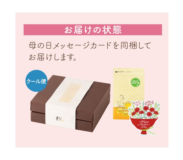 クール便 ※お届けについては「ご注文前に必ずご確認ください」をご覧ください ※セットのお茶もクール便でお届けいたします。お召し上がりの際は、常温に戻してから開封をお願いいたします。いきなり開封してしまいますと、温度差で水滴が発生し鮮度を損ねる可能性がございます。 |