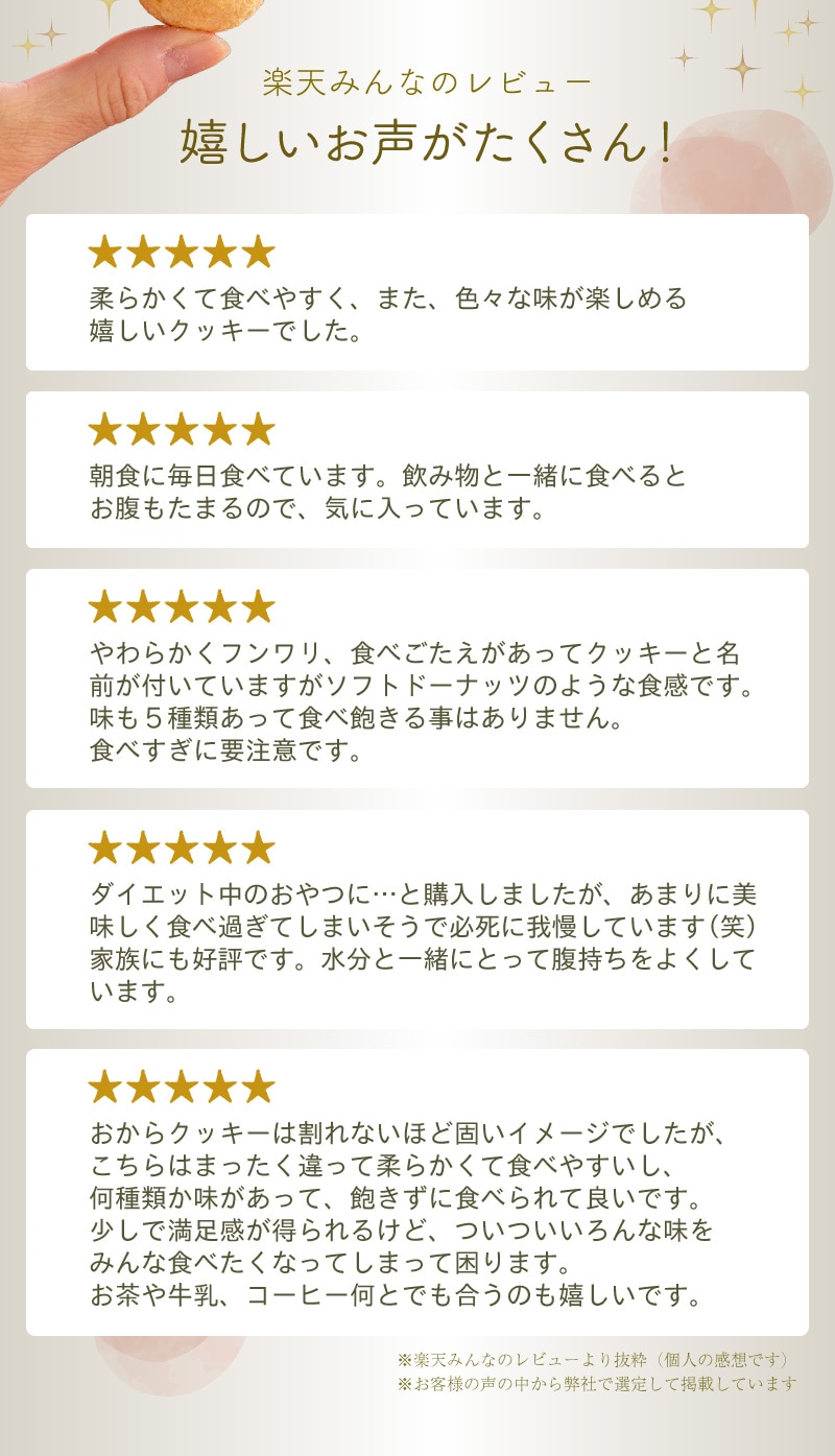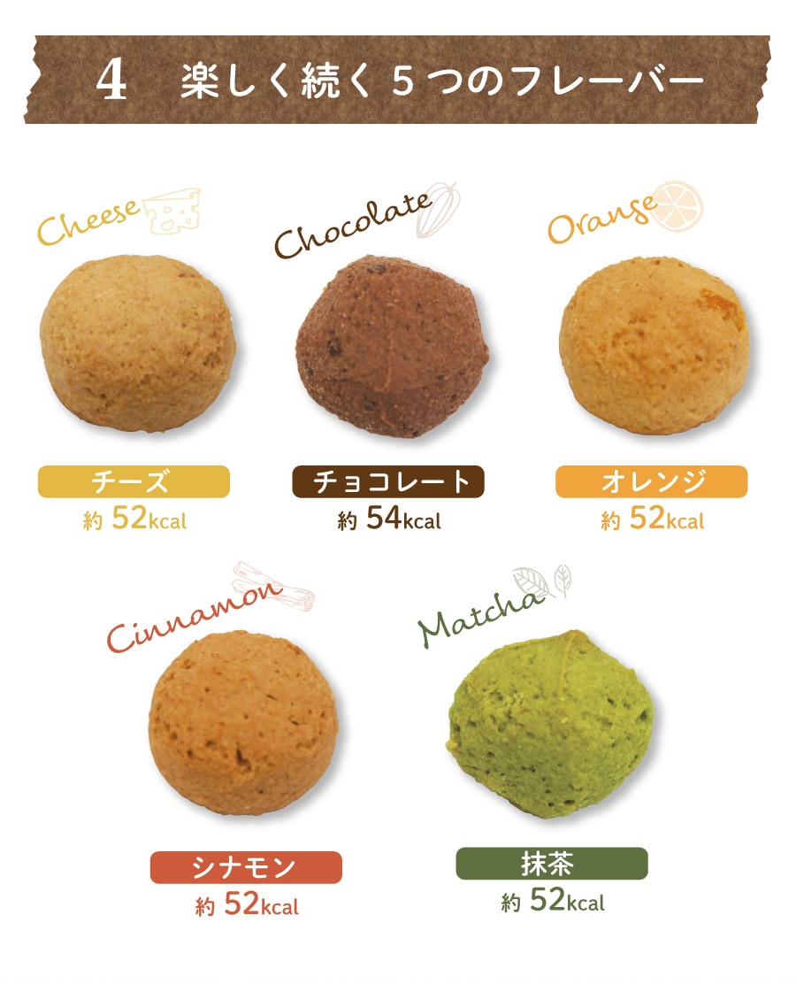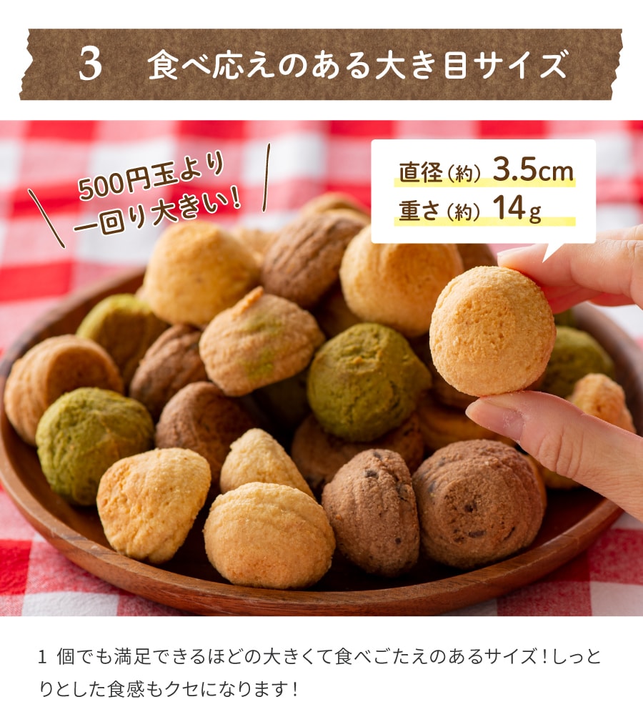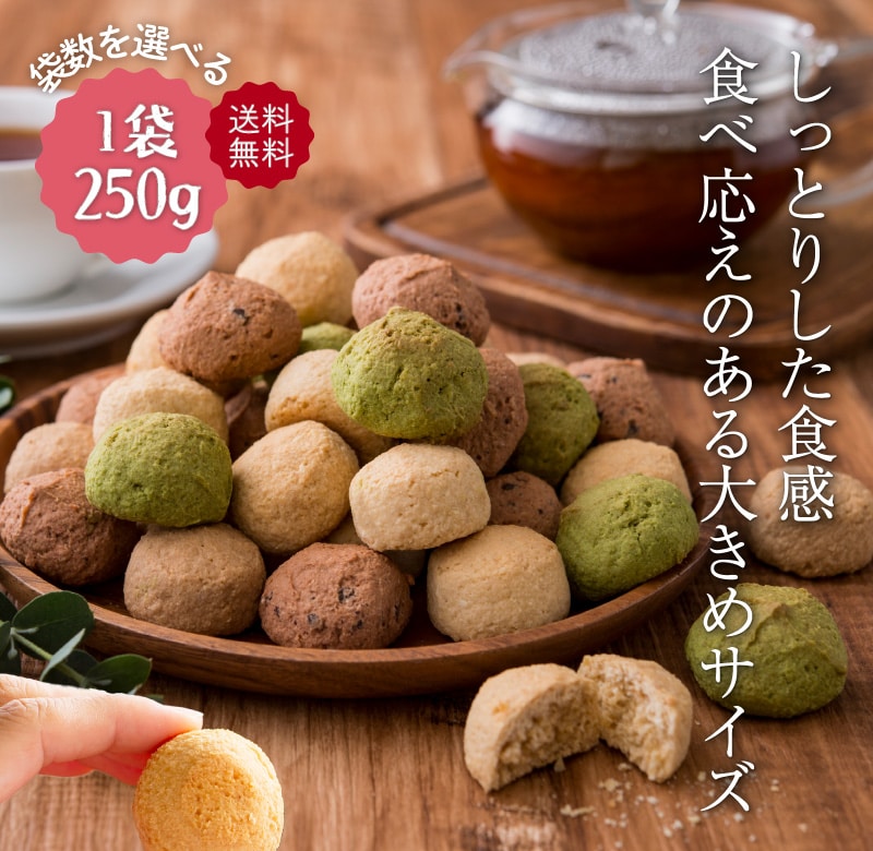 | 商品について | ※こちらの商品はプレーン・ココア・紅茶・紫いも・ほうれん草の5つの味のアソートです。商品により中身が均一でない場合がありますが、予めご了承ください。 ※簡易包装のため、一部割れ、欠けなどが生じる場合がありますが、予めご了承ください。 |